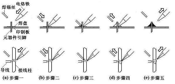 掌握好电烙铁的温度和焊接时间,选择恰当的烙铁头和焊点的接触位置,才可能得到良好的焊点。正确的手工焊接操作过程可以分成五个步骤,如图所示。