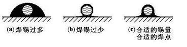 如图所示,过量的焊锡不但无必要地消耗了焊锡,而且还增加焊接时间,降低工作速度。更为严重的是,过量的焊锡很容易造成不易觉察的短路故障。焊锡过少也不能形成牢固的结合,同样是不利的。特别是焊接印制板引出导线时,焊锡用量不足,极容易造成导线脱落。