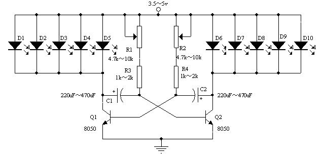 2、彩灯闪烁的周期是:T=0.7×(R1+R3)×C2+0.7×(R2+R4)×C1 根据闪烁快慢要求选择R1,R2,R3,R4,C1,C2的参数。调节电位器R1、R2的大小,可以改变闪烁速度。