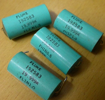 - 低TC(温度系数)线绕电阻,常见于老式国外(比如Fluke)各种精密仪器中,采用镍铬电阻合金,温度系数非常低,一般在1ppm/℃到5ppm/℃之间,有的电阻每一只都标明了实测温度系数。老化也不大,基本在20ppm/年之内,二手价格大约10元/只。这样的电阻进行标定后,可以作为一般标准电阻来用。
