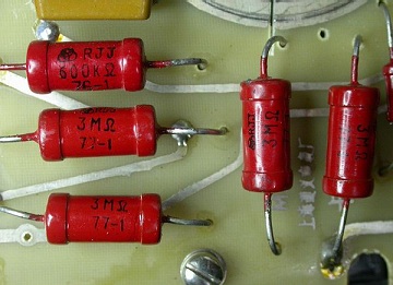 - 红袍电阻,代号RJJ,高稳定低温度系数精密金属膜,体积大,性能很好,经过自己的测试,多年的电阻,老化很少有超过0.5%的,温度系数都在30ppm/℃左右。请注意,红袍电阻还有一种是普通精度的,代号RJ,性能一般。