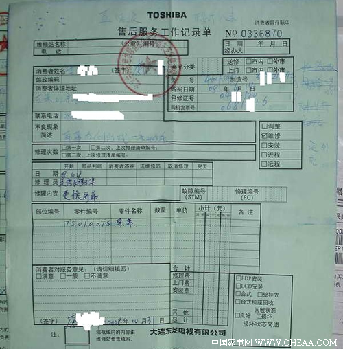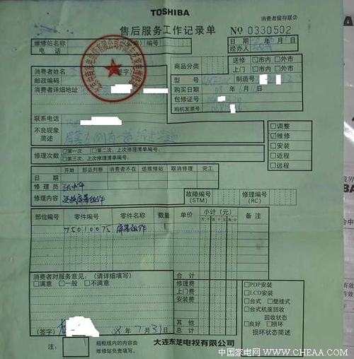 可见,换屏并没有从根本上解决东芝46XF300C液晶电视的问题,据记者根据众多案例分析,该机所使用液晶面板大概在观看2000小时左右就会出现竖线问题。“换了还坏”,显然东芝并没有找到该机问题的确切原因。如果仅是东芝所采购的这一批三星液晶面板有质量问题,那么就不要再给消费者更换此面板,应该积极与上游供应商S-LCD联系协作解决。如果是液晶模组驱动负载过高导致面板某部分极易损坏,就应该从IC电路和驱动器件上面找原因。如此以换屏来暂时敷衍消费者,不仅会给消费者带来能多的不便,同时东芝也要蒙受更大的损失。