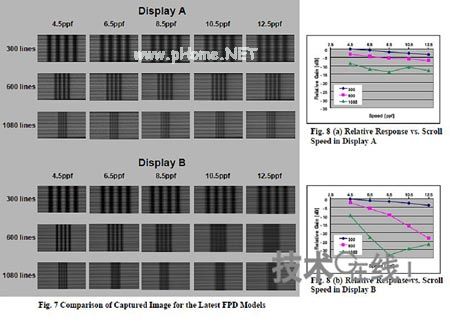 此次的发表资料披露了“Display A”和“Display B”两种显示器在视频分辨率定义为6.5ppf(每帧运动的像素数为6.5个)时的视频分辨率数据。数据显示,Display A的全高清分辨率为1080线,而Display B为950线,虽然基本接近于全高清分辨率,但仍稍逊一筹(图1)。另外,该公司还测量了12.5ppf(图像在2.5秒内由屏幕右端移至左端)时的视频分辨率,Display A可保持全高清分辨率1080线,而Display B却降至600线。估计Display A是最新款等离子电视,Display B是最新款240Hz液晶电视。