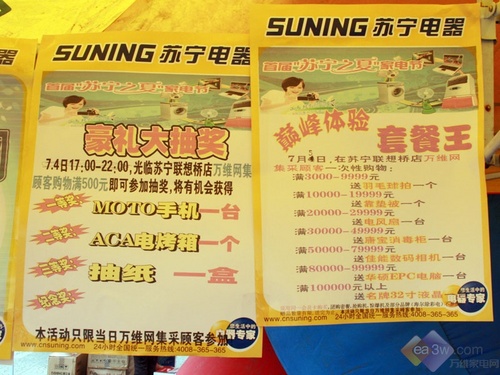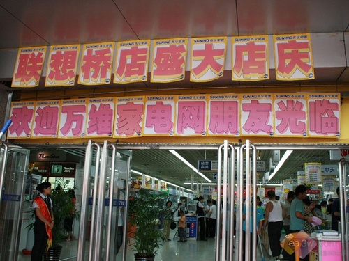 苏宁联想桥店正门横幅大字写着“欢迎万维家电网朋友光临”的标语