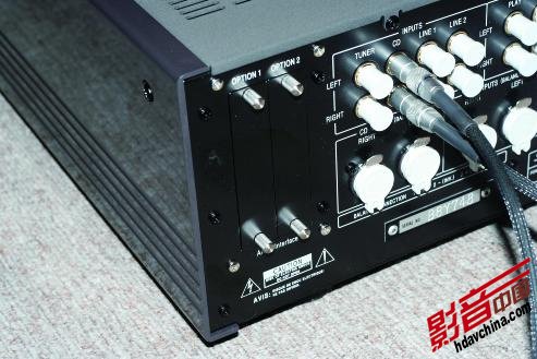 在接口方面,E-450背部的接线端子是相当丰富的。RCA高电平输入、XLR平衡输入,录音输出以及音箱接线端子,E-450都完全拥有。而且,它还配备“Pre Out”以及“Power In”这两个前/后级输入输出插座,方便用家外接更高水准的前级放大器或后级放大器。但是,对于聪明的玩家来说,可利用这组插座加入有源超低音音箱,以便获得更多的低频能量,进而可以在面积更大的聆听空间中使用。与此同时,E-450还提供了相当大的扩展性,它预留了两个可扩充插槽(Option1、Option2),用家通过外加DAC-20解码模组以及AD-20 MM/MC唱头放大模组就可以使E-450具备解码功能的同时又能对应LP黑胶唱盘。另外,细心的厂家还为每个接线端子制作了一只精美的绝缘套子,其目的是为了防止接线端子的金属部分长期暴露于空气之中产生氧化从而导致音质的劣化。